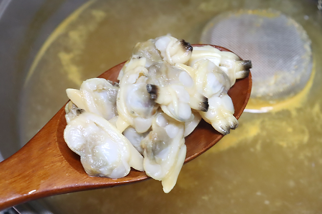바지락을 넣고 한소끔 팔팔 끓여줍니다. 해감이 잘된 바지락을 사용하면 잡내 없이 깔끔한 국물이 우러나요.
