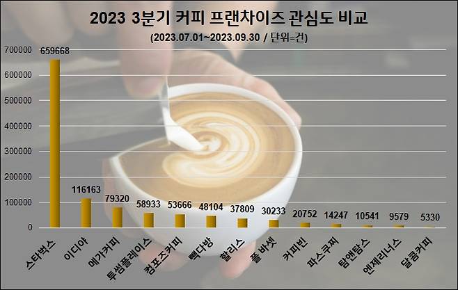 분석 결과, 스타벅스가 올 3분기 포스팅 수 65만 9,668건으로 독보적 1위에 올랐다.