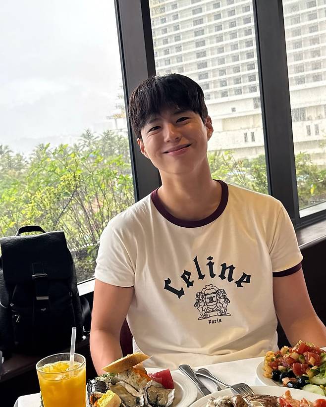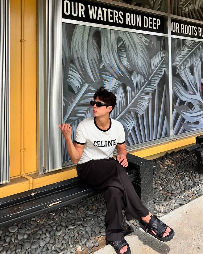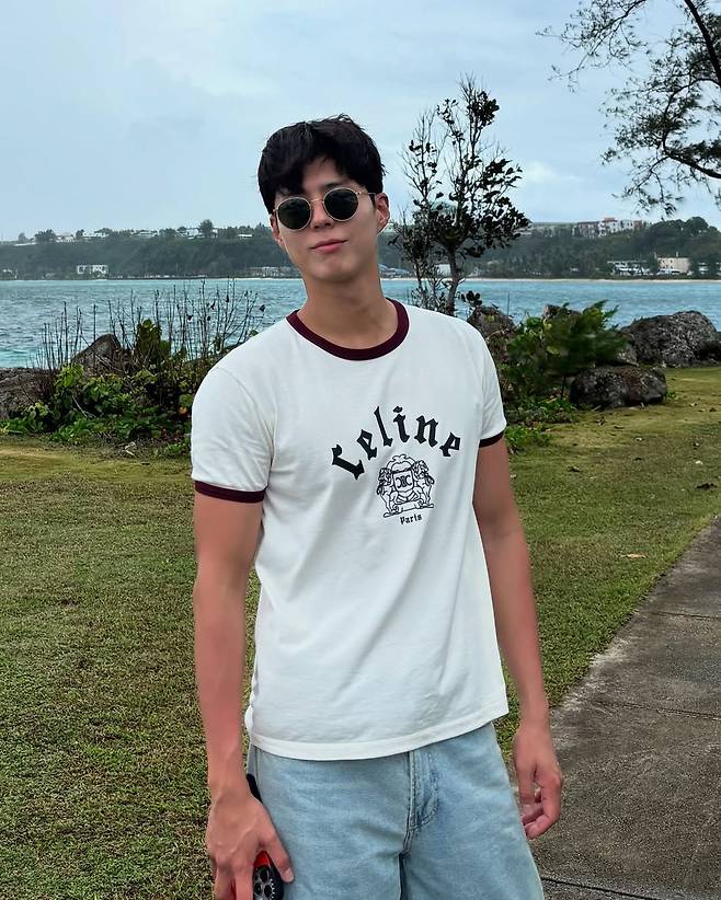 박보검은 깔끔한 화이트&블랙 라운드 티셔츠와 선글라스로 여유로운 리조트룩을 연출했다.
