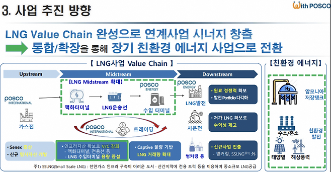 그 동안 포스코인터내셔널의 LNG 사업은 광구를 탐사 시추한 후 가스전을 개발하는 것이었다. 대우인터내셔널 시절인 2000년 미얀마 정부로 광구 탐사권을 부여받고, 13년 이상 탐사한 후 상업화에 성공했다. 포스코인터내셔널은 미얀마 가스전에서 LNG를 생산해 판매하는데, 합병 후 터미널을 통한 LNG 유통사업과 발전사업까지 영위하게 된다. 매출 규모도 2배 이상 늘어나며, LNG 사업을 본격 확대할 수 있게 된다. 이외에도 포스코인터내셔널은 액화터미널 및 전용선을 확대해 벙커링을 강화한다. LNG 거래량을 확대해 트레이딩 사업을 확대한다.