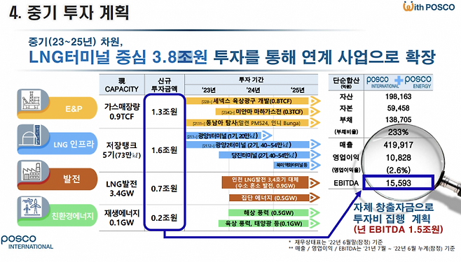 포스코인터내셔널은 LNG 사업에 3조8000억원을 투자한다. LNG 터미널을 건설하는데 1조6000억원을 투자할 계획이다. LNG 생산을 확대하는데, 총 1조3000억원의 투자금을 배정했다. LNG 발전과 친환경 에너지 사업에 각각 7000억원, 2000억원을 투자한다. 투자비는 포스코인터내셔널의 자체 창출자금을 활용한다. 현재 포스코인터내셔널의 연간 상각전영업이익(EBITADA)는 1조5000억원에 달한다. 포스코인터내셔널은 친환경 에너지 투자를 확대해 성장기업의 가치 창출을 극대화하겠다고 밝혔다.
