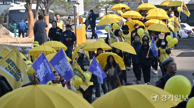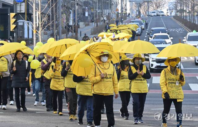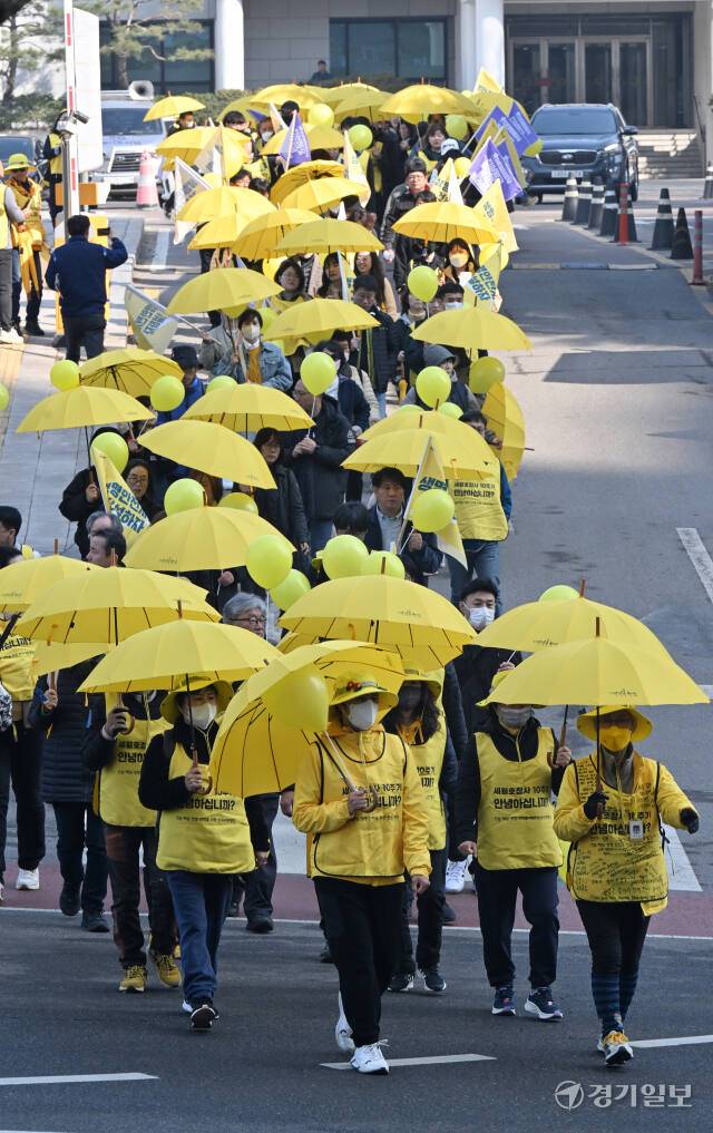 세월호 유족과 세월호 참사 19주기 인천위원회는 14일 오전 인천시청 앞에서 세월호 진상규명을 위한 정보 공개 및 추가 조사를 촉구하는 기자회견을 마치고 거리행진하고 있다.