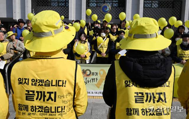 세월호 유족과 세월호참사 10주기 인천위원회는 14일 오전 인천시청 앞에서 세월호 진상규명을 위한 정보 공개 및 추가 조사를 촉구하는 기자회견 하고 있다.