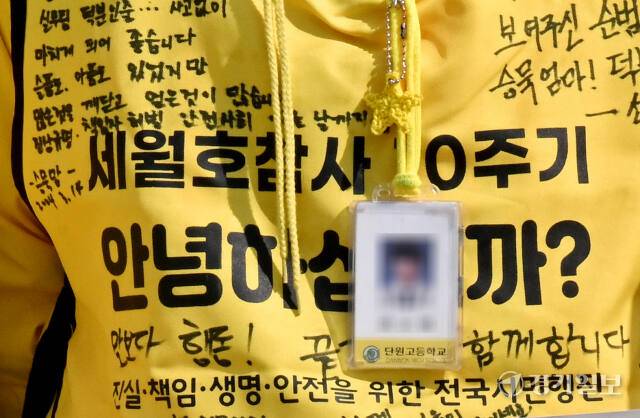 세월호참사 10주기 전국시민행진이 열린 14일 오전 인천시청 앞에서 세월호 유가족 목에 단원고 학생증이 걸려 있다.