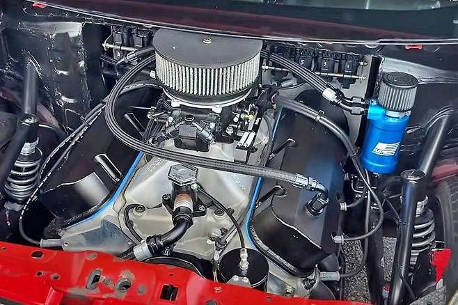 구체적인 엔진 제원은 영상마다 상이하게 언급되지만 두 가지 가능성이 제시된다. 첫 빌드 당시에는 10.3리터(632ci) 쉐보레 빅블록 V8 크레이트 엔진이 탑재되어 최고 출력 1,004마력, 최대 토크 121.2 kgf.m라는 놀라운 성능을 자랑한다는 것이다. 하지만 최신 드래그 주행 영상에서는 8.8리터(540ci) 사양으로 축소되었을 가능성도 제기된다. 출력이 다소 줄었다 하더라도 차체 무게가 고작 680kg에 불과하다는 점을 고려하면 여전히 엄청난 파워임은 확실하다.