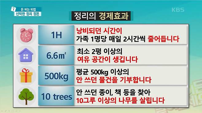 정희숙 : 네 맞습니다. 돈으로 환산하면 굉장합니다. 정리를 하면 낭비되던 시간이 가족 1명당 매일 2시간씩 줄어듭니다. 물건을 샀는데 찾느라 시간낭비하고 또 새로사서 수납하느라 시간낭비를 합니다
