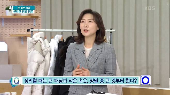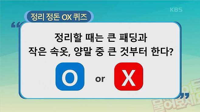 정희숙 : 정답은 O 입니다. 정리를 시작할때 양말이나 속옷 먼저 정리하는 분도 계시는데 부피가 큰것부터 정리를 하게되면 여유 공간이 생기고 훨씬 더 효율적입니다.