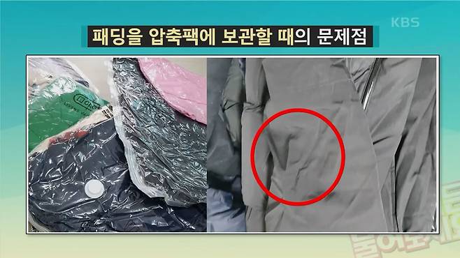 설재원(세탁전문가) : 정답은 X 입니다. 패딩의 충전재는 동물의 털입니다. 그렇다보니 압축을 하게되면 손상되게 되고 복원력과 보온성이 떨어지고 겉감에는 주름이 많이갑니다.