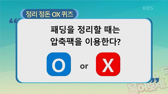 MC : 패딩 정리가 정말 어려운것 같은데, 공간을 많이 차지하는 패딩 어떻게 정리하면 좋을지 퀴즈 맞춰 볼까요?