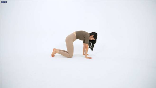 네 발 기기 자세로 준비합니다. 무릎 사이는 주먹 하나 반 정도 들어가게 벌려 주세요. 배꼽을 말아 넣는다는 느낌으로 호흡을 뱉으며 쏙 넣어줍니다. 복부를 척주로 붙여서 납작하게 유지합니다. 이때, 양 손바닥으로 바닥을 밀어내며 등을 천장 쪽으로 보내 줍니다. 복부의 힘으로 날개뼈를 밀어 줍니다. 허리를 마는 것이 아니라 위쪽 복부를 말아 주세요. 15회씩 3세트 진행해 주세요. 동작을 할 때 가장 중요한 것은 호흡을 뱉으면서 복부를 둥글게 말아 뒤로 보내 주는 거예요.