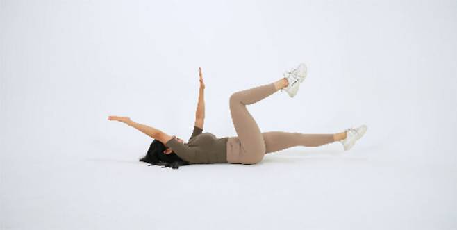 복부에 단단하게 힘을 주어 허리가 뜨지 않도록 최대한 매트 쪽으로 붙여 줍니다. 팔은 어깨 앞에 나란히 들어 주시고, 다리는 90도로 들어 유지해 줍니다. 팔과 다리를 교차하여 위아래로 움직여 줍니다. 이때 복부와 갈비뼈가 열리지 않도록 계속 닫아주는 힘을 줍니다. 허리가 많이 뜨는 느낌이 든다면 다리를 내리는 범위를 줄여 주세요.