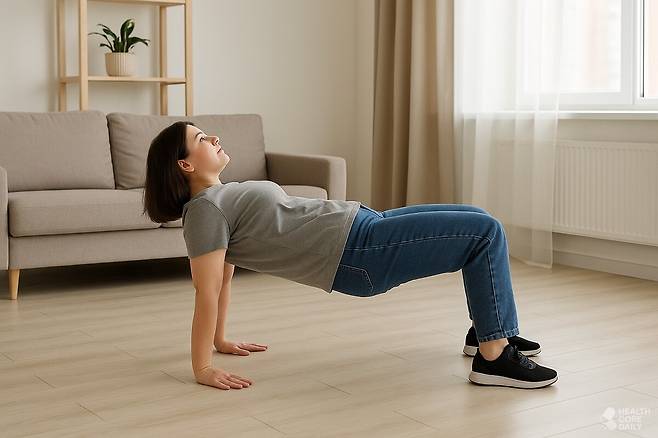 바닥에 앉아 다리를 엉덩이 너비로 벌리고, 손바닥과 발바닥을 단단히 바닥에 붙인다. 복부에 힘을 주며 몸을 들어 올려 어깨부터 무릎까지가 일직선이 되도록 유지한다. 팔은 어깨 바로 아래에 두고 자세를 안정시킨다. 강도를 높이려면 한쪽 다리를 반대쪽 무릎 위에 올려 들고 버틴다. 왼쪽과 오른쪽 다리를 번갈아가며 약 1분간 유지하면 코어와 엉덩이 근육의 자극을 극대화할 수 있다.