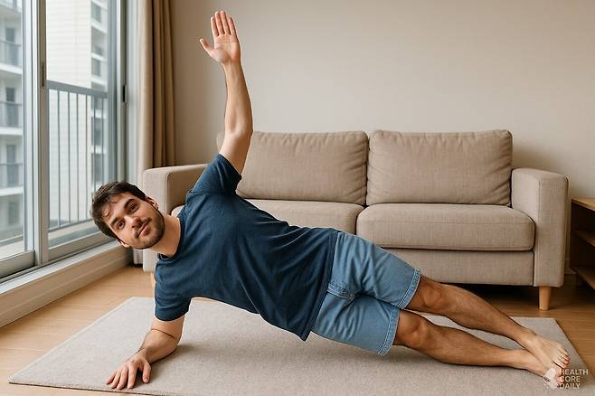 기본 플랭크 자세에서 몸을 옆으로 돌려 오른손과 오른발로 몸을 지탱한다. 왼손은 천장을 향해 뻗고, 시선은 손끝을 바라본다. 복부에 힘을 주고 엉덩이가 바닥으로 처지지 않게 유지하며 10회 정도 호흡한다. 반대 방향으로 같은 방법을 반복하고, 각 측면당 20초씩 3세트부터 시작해 점차 시간을 늘려간다. 균형 잡기가 어렵다면 위쪽 팔을 몸 옆으로 붙여 안정시킨다.