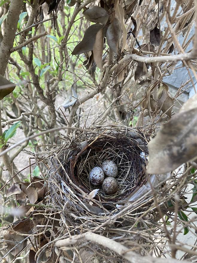 다음 날 아침, 역시나 둥지는 비어 있었다. 일찍부터 또 비행 연습을 하나보다 싶었는데, 오늘은 이상하게 아무 소리가 들리지 않았다. 수풀 속 여기저기를 살펴봐도 홍관조 가족이 보이지 않았다. 뭔가 싸한 느낌이 들었지만, 아마도 근처로 비행 실습을 나갔을 거라고 생각하며 학기 말의 바쁜 하루를 보냈다. 틈틈이 창밖을 내다봤지만, 수풀은 여전히 고요했다. 그날 저녁에도, 밤에도, 다음 날 아침까지도 홍관조 가족은 돌아오지 않았다. 그렇게 빈 둥지만 덩그러니 남게 되었다. 서운하고 허전했다. 올 때도 마음대로 오더니 갈 때도 마음대로 간 이웃사촌이 야속하기도 했다. 걱정도 되었다. 아기 새들은 엄마 아빠와 함께 날아간 걸까. 아직 나는 것도 서툴고, 수풀 밖 세상은 험난할 텐데 말이다. 한 달 남짓한 우리의 동거가 꽤 진한 여운을 남겨서인지 아니면 마지막 학기가 끝나고 졸업을 앞두고 있어서인지 조금 헷갈리기는 했지만, 아무튼 허한 기분이 한동안 가시지 않았다.