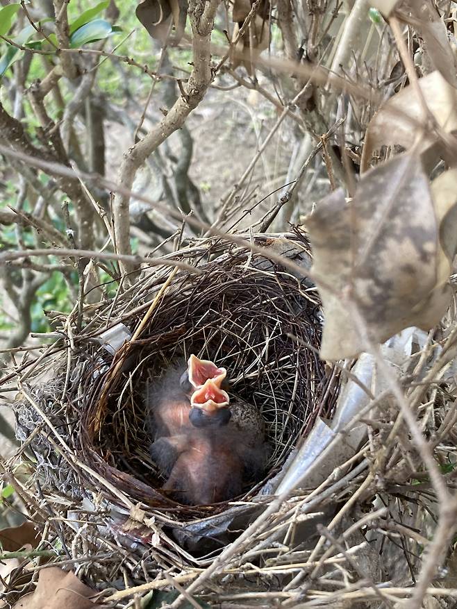또 한 2주쯤 지났을 때였다. 그날도 조심스럽게 둥지 안을 훔쳐보는데, 새끼들이 보이지 않았다. 혹시 뱀이라도 다녀간 건지 걱정하던 마음도 잠시, 다행히도 어디선가 짹짹 소리는 계속 들려왔다. 찬찬히 둘러보니 둥지 아래 나뭇가지에 작은 회갈색 털북숭이 두 마리가 나란히 앉아 있었다. 언제 이렇게 자라서 둥지 밖으로 걸어 나갔는지, 딱히 한 일도 없는 내가 다 뿌듯하고 뭉클해졌다. 새끼들 앞에서는 어미 새가 자꾸 근처로 날아갔다 돌아왔다 반복하면서 짹짹거리고 있었다. 아마도 비행 훈련을 시키는 것 같았다. 나뭇가지 위를 종종걸음으로 걷다가, 날개를 소심하게 펴봤다가, 균형을 잃고 기우뚱했다가, 결국 가지에서 미끄러져서 아래쪽 나뭇가지에 겨우 걸터앉으면서, 아기 새들은 하루 종일 열심이었다.