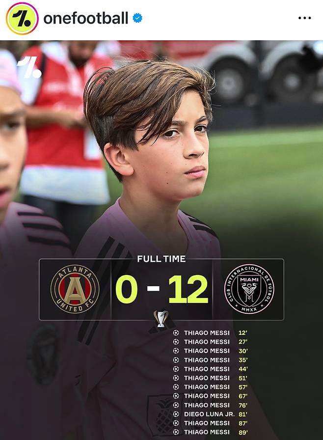 매체는 "발롱도르 8회 수상에 빛나는 메시의 아들 티아고가 최근 치러진 U-13 경기에서 놀라운 공연을 펼쳤다. '비인스포츠'에 따르면 마이애미는 이날 12-0 승리를 거뒀는데 그중 티아고가 11골을 집어넣었다"라고 전했다.