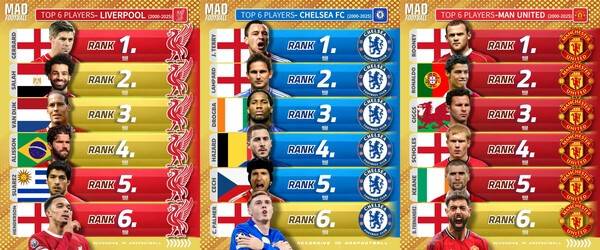 축구 콘텐츠 제작소 '매드풋볼'은 18일(한국시간) "21세기 프리미어리그 '빅6' 클럽별 최고의 선수 6인을 선정했다"고 발표하며 아스널, 맨체스터 시티, 맨체스터 유나이티드, 첼시, 리버풀, 토트넘의 레전드들을 조명했다.