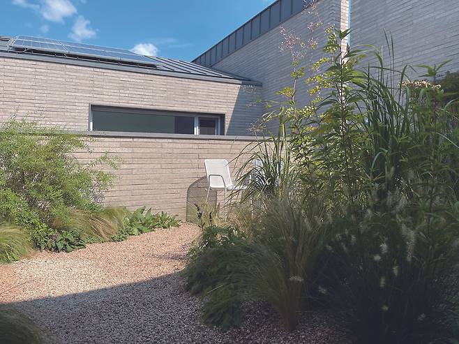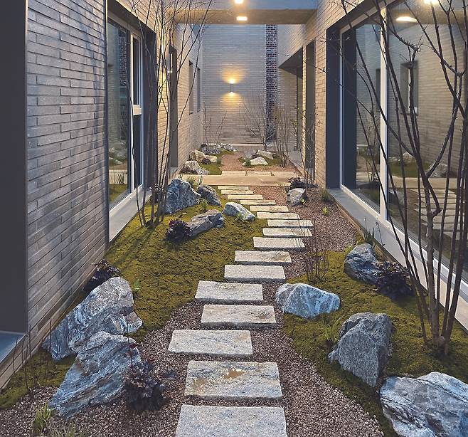 1층 정원은 건물로 둘러싸인 소위 ‘중정’ 형태를 띠며 실내의 거의 모든 창을 통해 바라보이는 곳이었다. 주택 생활에서 특히 중요한, 주방에서 정원이 잘 들여다보였으므로 설계 초기부터 창문 위치를 꼼꼼하게 확인했다. 먼저, 긴 형태였기에 한쪽 끝에서 다른 한쪽 끝까지 거닐 수 있는 동선을 확보했다. 이어 그 주변에 선이 자연스러운 크고 작은 나무, 무심하게 놓인 돌, 돌 틈에서 자라난 반음지성 초화 등을 배치했고 이끼와 자갈로 흙을 덮어 설계를 마무리했다.