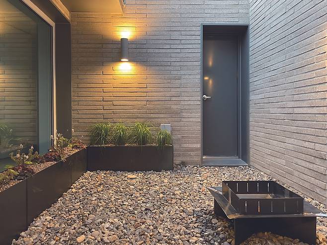작은 테라스는 물 빠짐을 고려해 쇄석으로 바닥을 마감한 후 주변에 철제 화단을 만들어 그 내부에 식물을 심었다. 중앙에는 날씨 좋은 날 색다른 정원을 즐길 수 있도록 철제 화롯대를 배치했다.