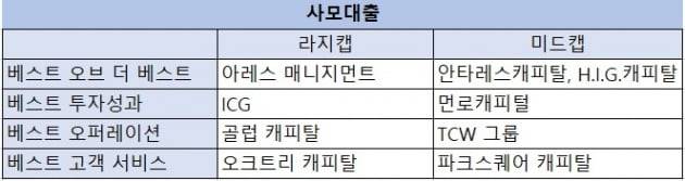 라지캡 사모대출 부문에서는 미국 아레스 매니지먼트가 올해로 3년 연속 한국 기관들이 가장 선호하는 최우수 PD 운용사로 뽑혔다. 아레스는 지난해말 기준 AUM이 3520억 달러에 달하는 자산 운용사다.