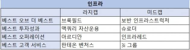 라지캡 인프라 부문의 최우수 운용사로는 캐나다 브룩필드 애셋 매니지먼트가 뽑혔다. 부동산, 인프라, 사회기반시설, 사모펀드, 사모대출 등에 걸쳐 총 8000억 달러 규모의 자산을 운용하고 있다. 국민연금 등 국내 주요 LP들이 2013년부터 50조원 이상을 브룩필드 펀드에 출자하기도 했다. 본사는 토론토에 있고 뉴욕, 런던, 리우데자네이루, 시드니 등에서 지사를 운영 중이다.