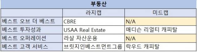 각 자산군별로 세 개 부분에 걸쳐 가장 많은 표를 받은 업체는 최우수(Best of the best) 운용사로 선정했다.
