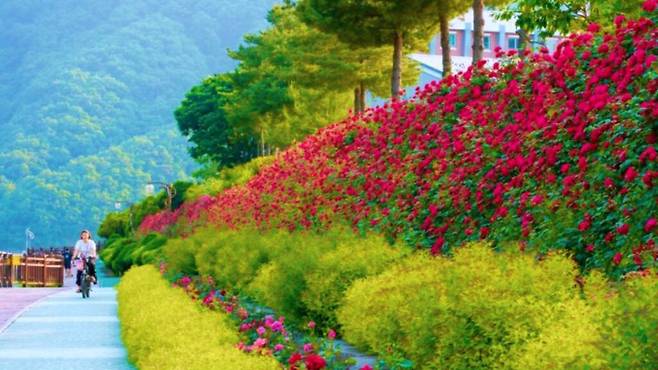 충북 단양의 강변이 다시 한번 형형색색의 꽃들로 채워졌다. 단양읍 단양고등학교에서 상진리 강변까지 약 1.2㎞ 구간에 조성된 장미터널에 장미꽃이 만개해 방문객들의 눈길을 사로잡고 있다.