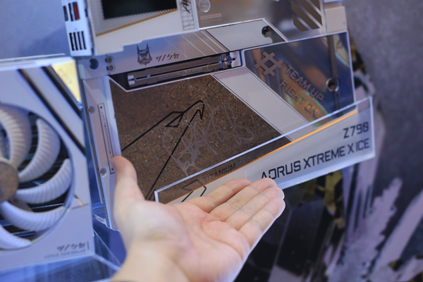 메인보드 아래쪽 방열 플레이트는 고온으로 열처리한 티타늄으로 마감되어 있습니다. 흰색으로만 도배한 것이 아니라 다양한 색상으로 아름답게 포인트를 줘서 더욱 호화로워 보입니다. 메인보드에는 펫 갤싱어 인텔 CEO의 친필 싸인, 그래픽카드에는 젠슨 황 엔비디아 CEO의 친필 싸인이 되어 있어서 더욱 탐나는 전시품입니다.