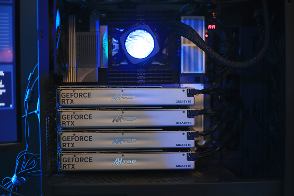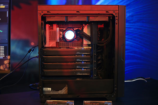 혹시 아까 AMD 리사 수 누나가 싸인한 AMD TRX50 워크스테이션 메인보드, 기억나시나요? 바로 그 메인보드를 활용한 AI 학습/연구 모델 워크스테이션입니다. 메모리도, AI 연산용 그래픽카드도 빽빽하게 들어찬 위용이 대단합니다. 연산용 카드는 AMD의 라데온 프로 W7900을 4개 구성했으며, 파워 서플라이도 AI 연산용 본체를 염두에 두고 새로 설계한 기가바이트 울트라 듀러블 AI TOP 1600W 80PLUS PLATINUM 을 사용했습니다.