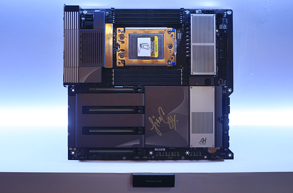 리사 수 누님의 친필 싸인이 그려진 새 TRX50 워크스테이션용 메인보드도 전시됐습니다. 이름은 기가바이트 TRX50 AI TOP이며, AI 연산이나 학습 등에 특화한 메인보드임을 짐작하게 합니다. 라이젠 쓰레드리퍼(프로 포함) 7000 시리즈와 호환되고 총 8개의 DDR5 메모리 장착 슬롯과 4개의 그래픽카드 장착 슬롯을 지녔습니다.