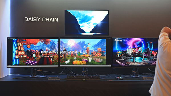 기가바이트는 데이지 체인 기술을 모니터에 적용합니다. 어로스 FO27Q3(상단 모니터)와 어로스 FO32U2P(하단 모니터 3개)를 데이지 체인으로 묶어뒀군요. 기가바이트 데이지 체인 적용 모니터를 이용해서 다중 모니터 시스템을 구축한다면 PC 본체와 모니터를 연결하는 케이블은 딱 1개만 있으면 됩니다. 나머지는 모니터와 모니터를 이어주는 케이블만 쓰면 되거든요.