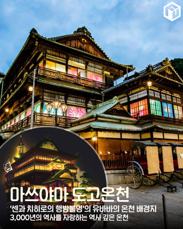 일본 '센과 치히로의 행방불명' 유바바의 온천 배경지인 도고온천이 자리한 마쓰야마입니다. 도고 온천 약 3000년의 역사를 자랑하며 일본 내 가장 오래된 온천 중 한 곳입니다.