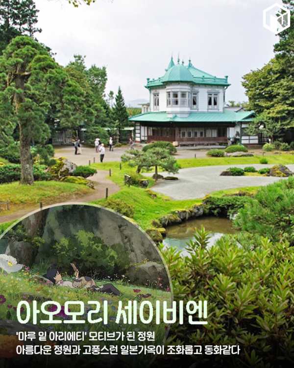 ' 마루 밑 아리에티' 모티브가 된아오모리 세이비엔입니다.아오모리 세이비엔은 아름다운 정원과 고풍스런 일본가옥가 조화롭고 이국적으로 산책을 하며 애니메이션 속 고즈넉하고 아기자기한 일본 정원을 느껴보시길 바랍니다.