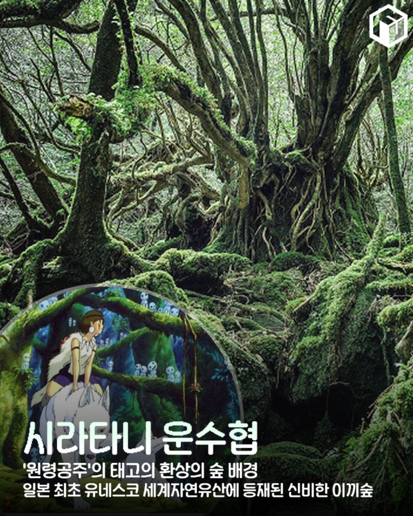 지브리 애니메이션 '원령공주'의 태고의 환상의 숲 배경인 시라타니 운수협입니다. 가고시마현 야쿠시마 북부에 위치한 이 이끼숲은 일본 최초 유네스코 세계자연유산에 등재된 숲입니다.
