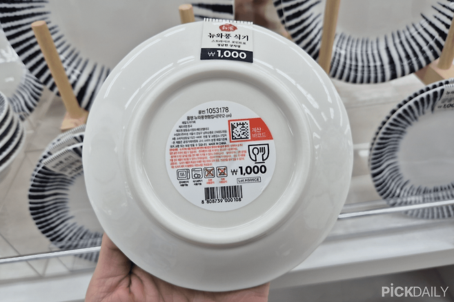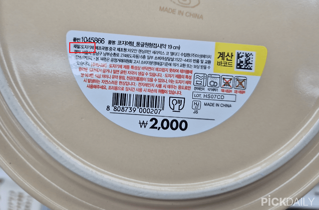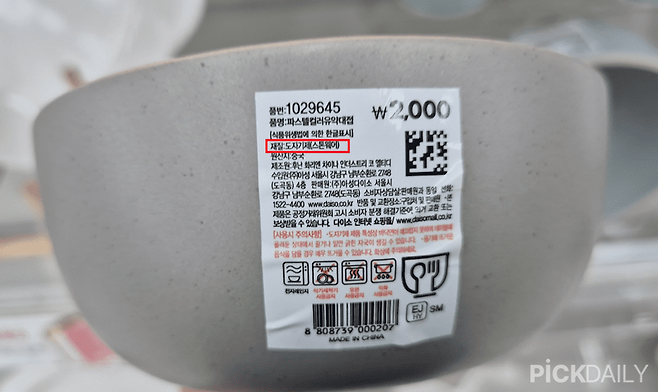 다이소에서 도자기 제품을 구매할 땐 바닥에 붙어 있는 라벨을 확인해보자. 라벨을 자세히 살펴보면 상품 정보를 상세히 알 수 있는데, 도자기 재질에 대한 정보가 적혀있다.