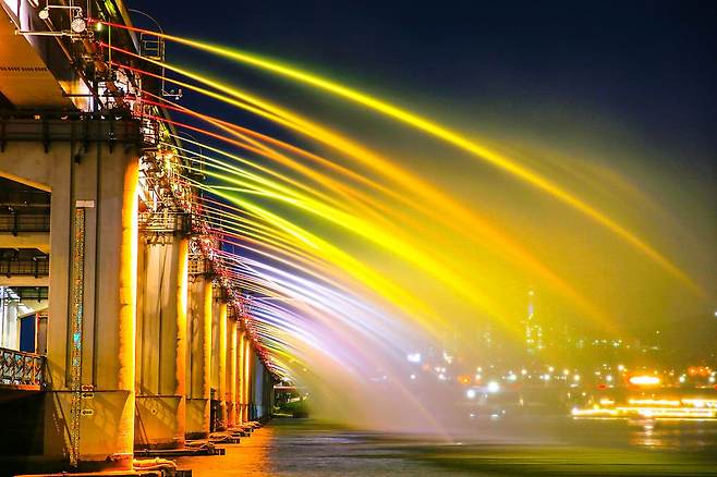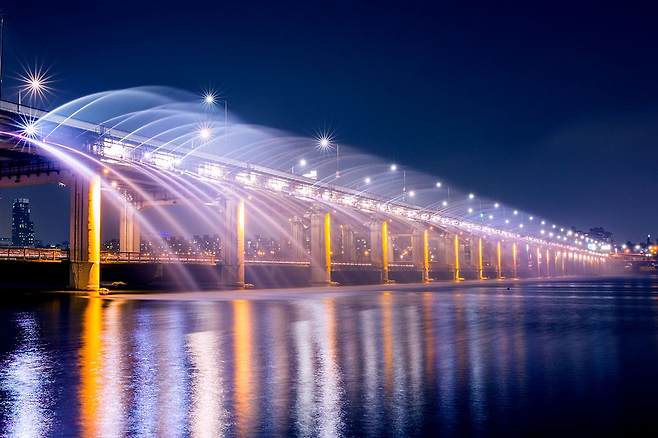 4월부터 10월까지 매일 밤, 반포대교를 수놓는 달빛무지개분수쇼로 활기를 띱니다. 음악과 함께 380개의 무지갯빛 조명이 한강을 비춥니다.