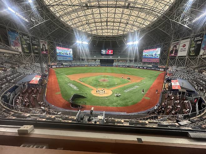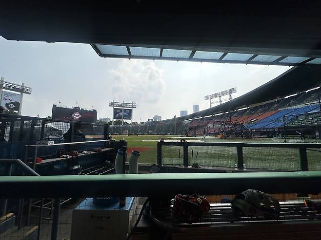 우리 해설위원 한 분이 취재를 위해서 그라운드에 내려가다가 바로 다시 올라왔습니다.