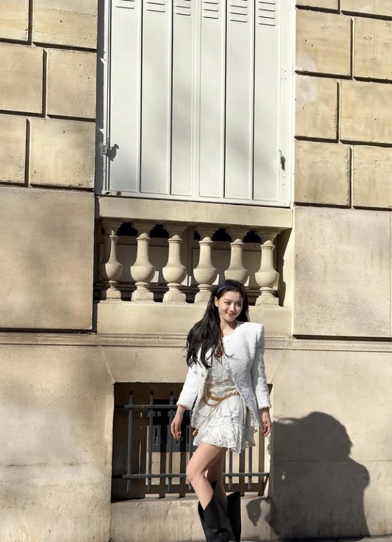 김유정은 최근 프랑스 파리에서 열린 발망 패션위크에 참석해, 화이트 타이 블라우스와 블랙 시스루 자켓을 매치한 룩으로 화제를 모았다.