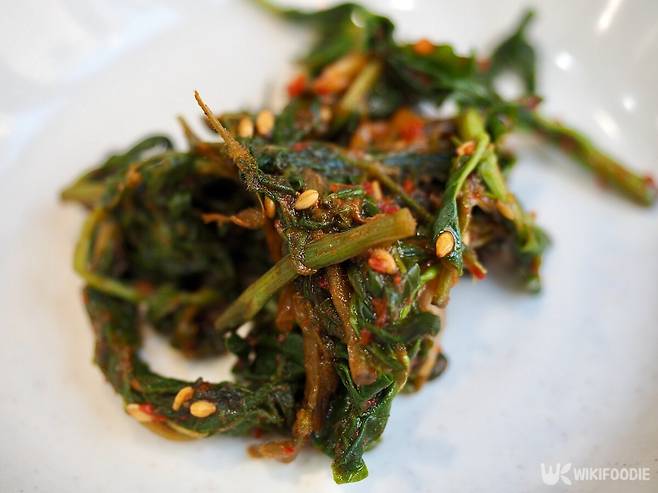 무치는 방법은 정말 간단하다. 물기를 뺀 개망초를 볼에 담은 뒤, 고추장, 된장, 들기름 순으로 양념을 넣고 손으로 조물조물 무쳐준다.