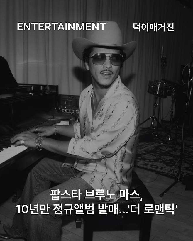 세계적인 팝스타 브루노 마스가 10년 만에 솔로 정규앨범을 내놓는다고 합니다. 음반사 워너뮤직코리아는 브루노 마스가 다음 달 27일 네 번째 정규 앨범 '더 로맨틱'(The Romantic)을 발매한다고 8일 밝혔습니다. 마스가 솔로 정규 앨범을 발매하는 것은 2016년 공개한 3집 '24K 매직'(24K Magic) 이후 10년 만입니다. 2021년에는 팝스타 앤더슨 팩과 실크 소닉을 결성해 앨범을 발매했습니다.