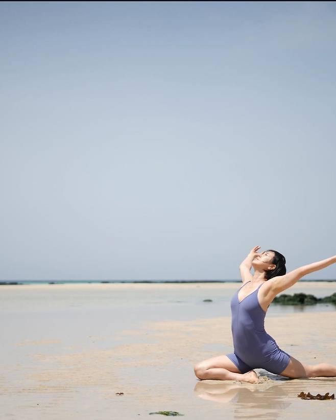 윤진서는 짙푸른 바다와 고운 모래사장을 배경으로 요가 포즈를 취하며 시선을 사로잡았습니다.