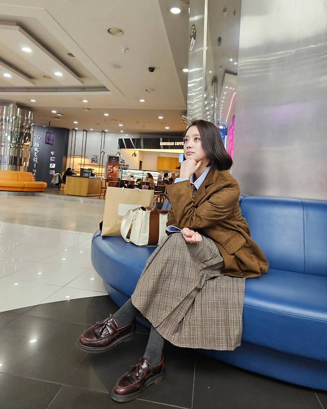 네 번째 사진에서는 브라운 재킷과 체크 패턴 스커트를 매치해 클래식한 스타일을 선보였다. 브라운 톤의 재킷은 따뜻하면서도 고급스러운 느낌을 주며, 롱스커트와 함께 차분하고 격식 있는 분위기를 연출한다. 여기에 로퍼와 그레이 삭스를 더해 전체적으로 빈티지하면서도 현대적인 감각을 살렸다.