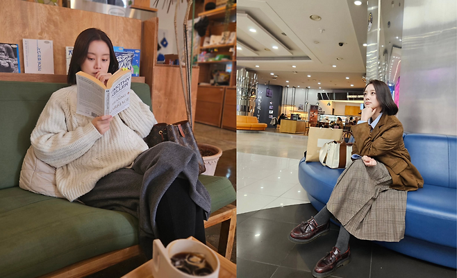 세 번째 사진에서는 오버사이즈 화이트 니트와 그레이 롱스커트를 매치해 편안하면서도 단정한 분위기를 연출했다. 루즈한 니트는 여유로운 실루엣을 강조하며, 스커트와의 조화로 여성스러운 무드를 더했다. 책을 읽는 모습과 함께 차분한 분위기가 어우러져 따뜻하고 지적인 이미지를 완성했다.