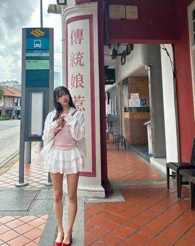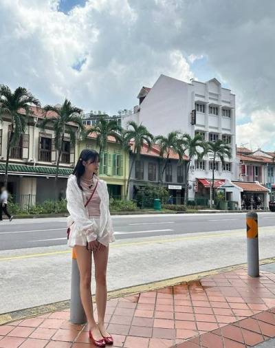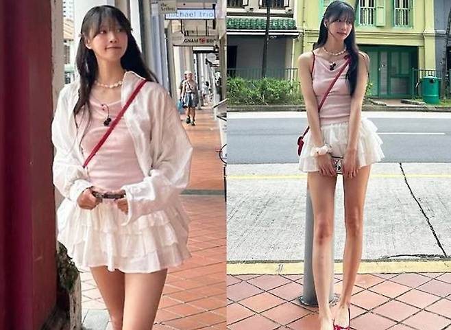 미주 님이 선택한 바캉스룩은 핑크 슬리브리스 탑에 프릴 미니 스커트 조합! 🌸 사랑스러움이 뚝뚝 떨어지는 스타일링이에요. 시폰 소재의 스커트가 살랑살랑 💃 움직일 때마다 여리여리한 분위기가 뿜뿜! 여기에 레드 컬러 크로스백과 플랫슈즈👠로 포인트를 뙇! ✨ 컬러감까지 완벽하게 잡은 센스, 인정합니다👍.