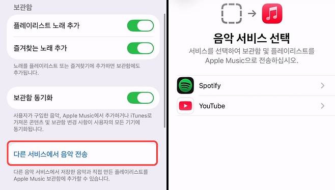 음악 앱 설정에서 아래 쪽으로 이동하면 '다른 서비스에서 음악 전송' 항목을 찾을 수 있다. 이 항목을 누르게 되면 스포티파이와 유튜브 뮤직 중에서 고를 수 있다.