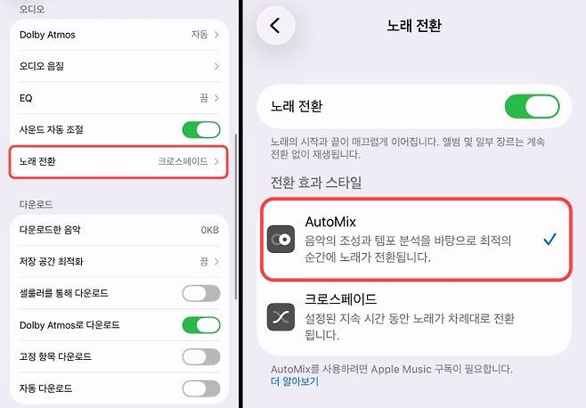 설정 방법은 어렵지 않다. 음악 앱 설정에 들어가 '노래 전환' 항목을 선택해 보자. 그럼 기존 크로스페이드 설정 외에 '오토믹스'가 새롭게 생긴 것을 발견할 수 있다. 오토믹스를 선택하고 노래를 재생하면 바로 변화를 체감할 수 있다.