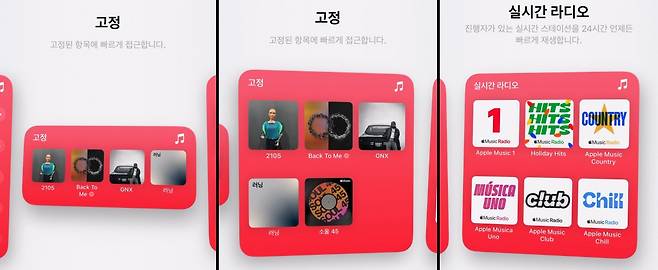 애플 뮤직 업데이트와 함께 새로운 위젯 3종도 추가되었다. 앞서 소개한 플레이리스트 고정 기능과 관련한 위젯 2종, 실시간 라디오 위젯으로 구성된다. 고정 위젯은 크기에 따라 사용자가 고정한 플레이리스트 4개와 6개 전체를 보여주는 위젯으로 나뉜다.