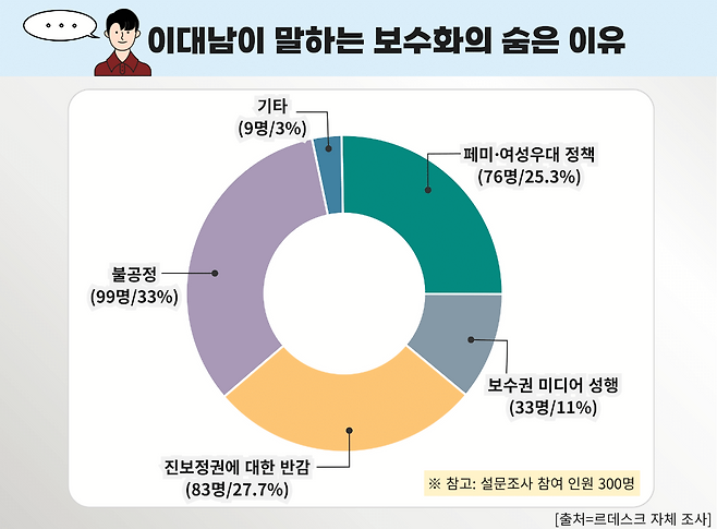 르데스크가 20대 남성 300명을 대상으로 진행한 설문조사에 따르면, 응답자의 33%가 보수정당을 지지하는 이유로 ‘불공정’을 꼽았다. 이어 진보정권에 대한 반감(27.7%), 여성우대정책(25.3%), 보수 미디어의 영향(11%)이 뒤를 이었다.