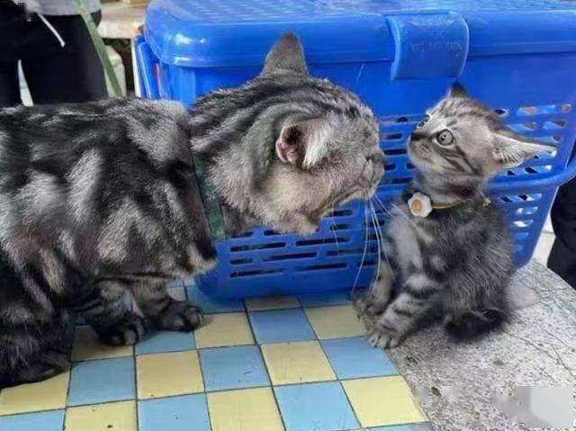 아빠 고양이가 먼저 다가와 냄새를 맡자, 아기 고양이는 살짝 긴장한 듯했지만 도망치지 않고 엉덩이를 바닥에 붙인 채 자리를 지켰습니다.