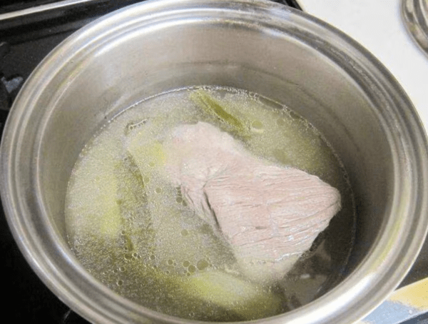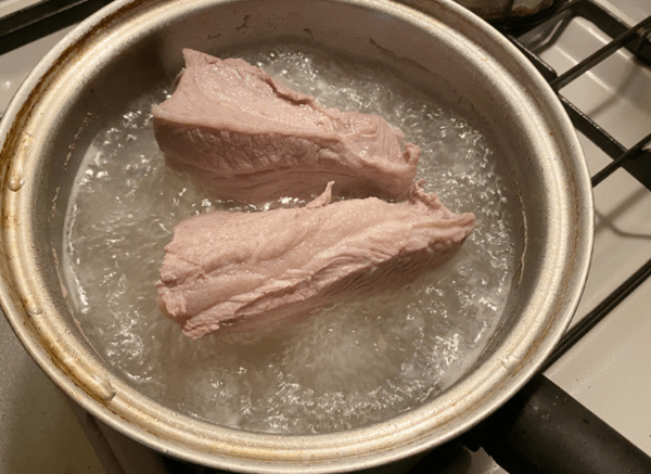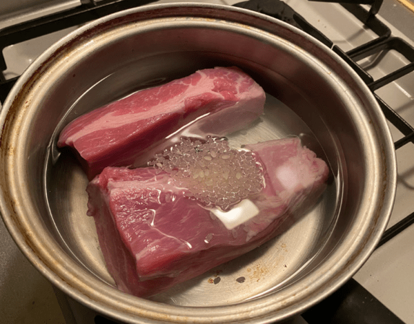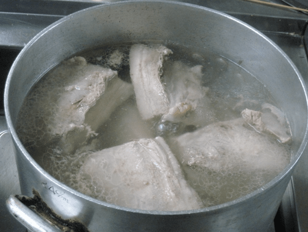 먼저 냄비에 삼겹살을 넣고 물을 부어준다. 여기에 통후추와 소금, 설탕을 넣어 기본적인 간을 만든다. 그리고 미원을 약간 넣어 감칠맛을 더한다.